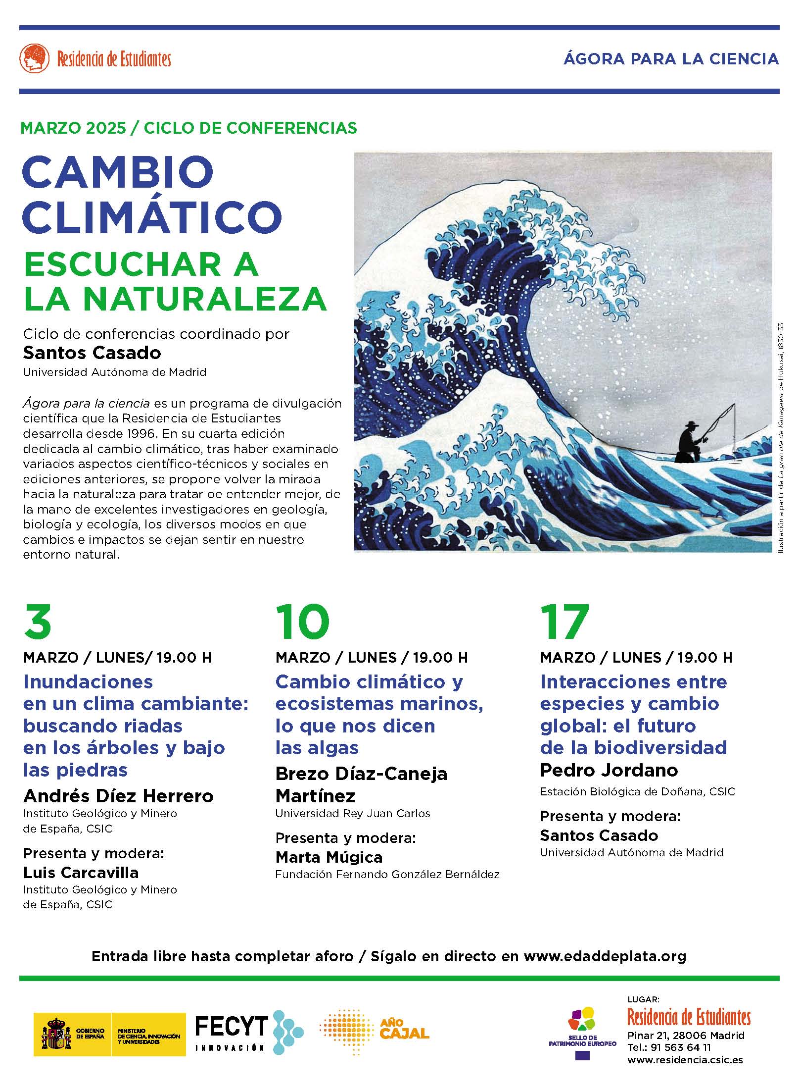 La primera charla divulgativa, titulada Inundaciones en un clima cambiante: buscando riadas en los árboles y bajo las piedras, a cargo de Dr. Andrés Díez Herrero (IGME, CSIC), está prevista para el lunes 3 de marzo de 2025 a las 19:00 horas. La sesión será presentada y moderada por el Dr. Luis Carcavilla (IGME, CSIC) y se retransmitirá en directo desde la web www.edaddeplata.org
