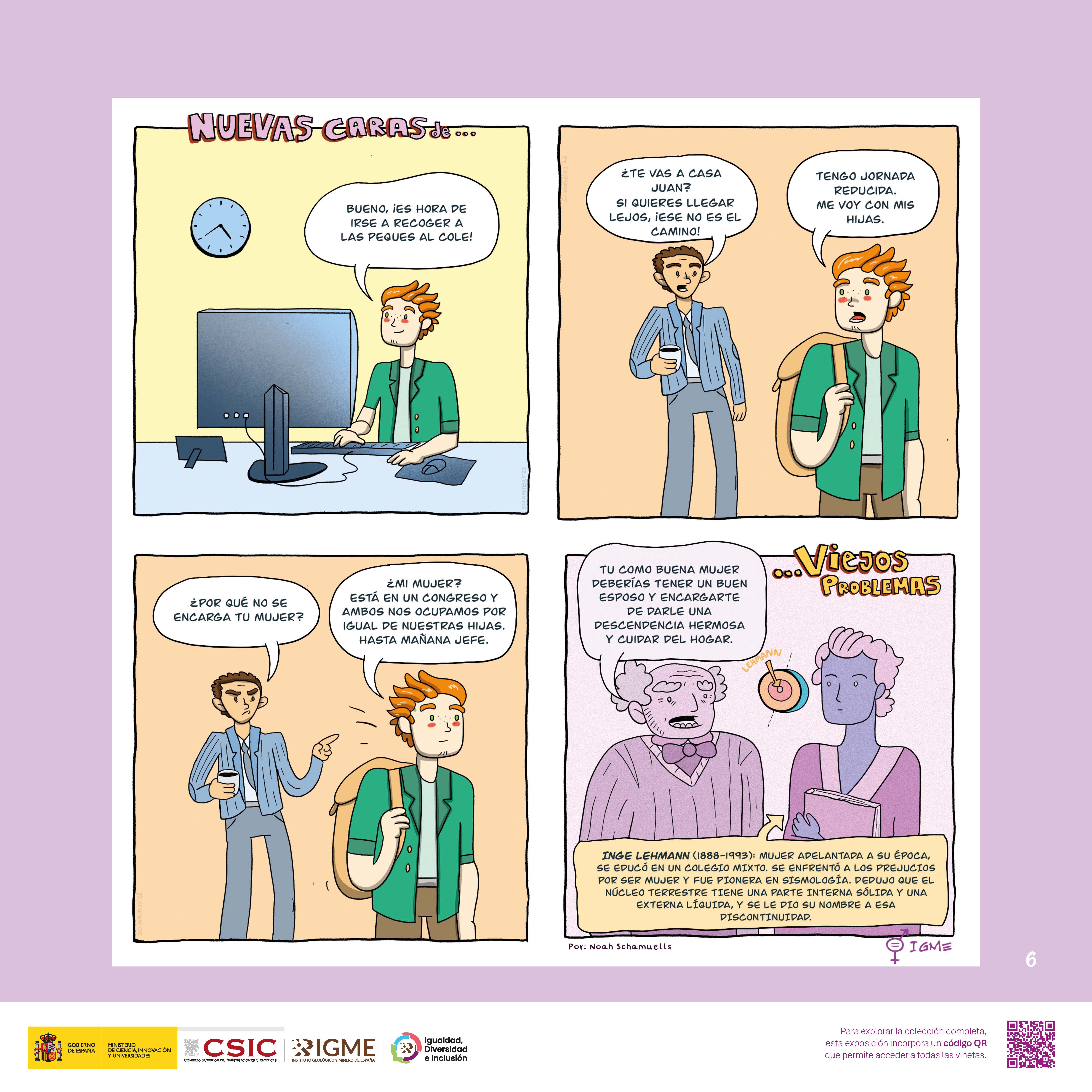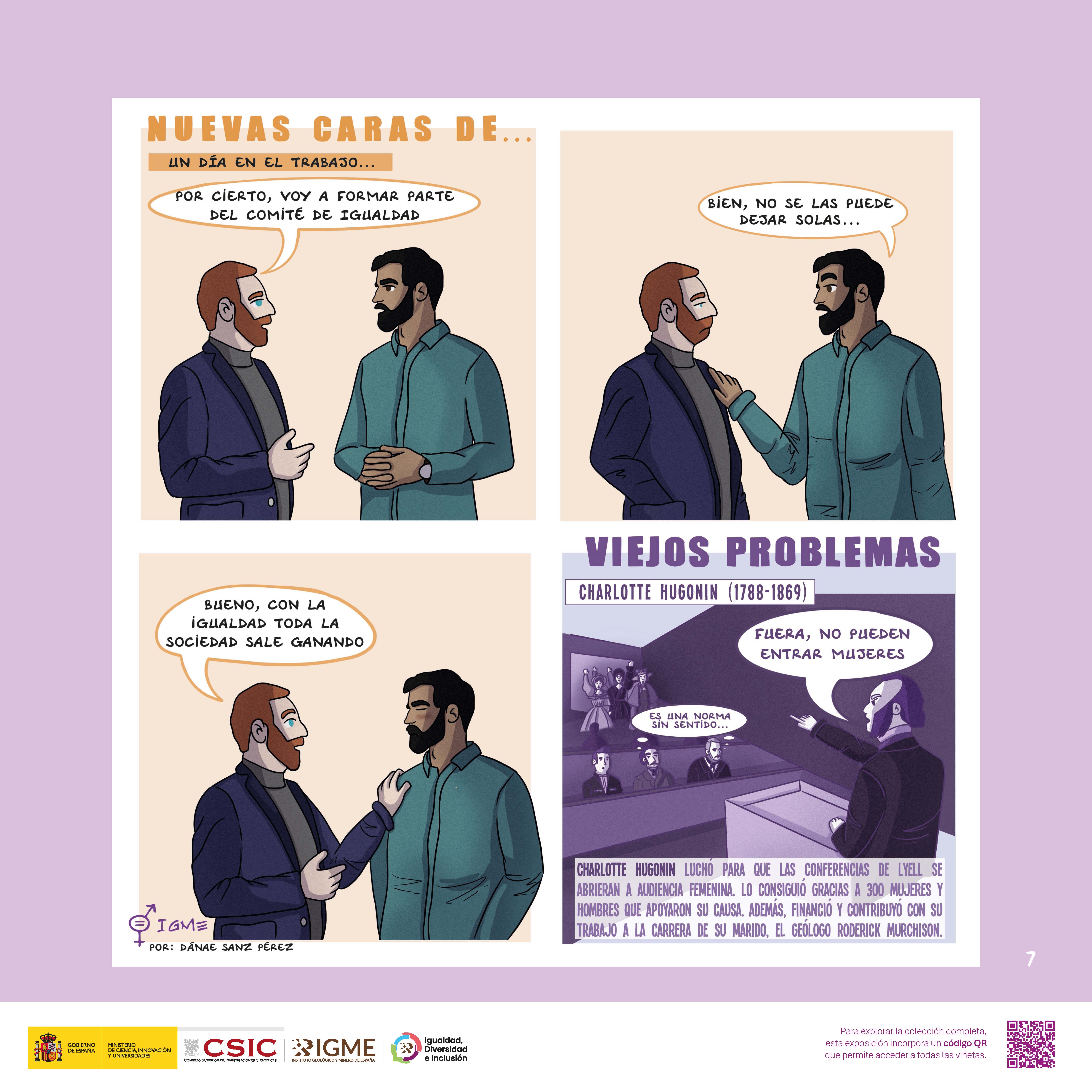 Las situaciones representadas están basadas en experiencias reales recogidas por el Comité de Igualdad del IGME. Comprobarás cómo muchos de los retos del pasado siguen presentes hoy.