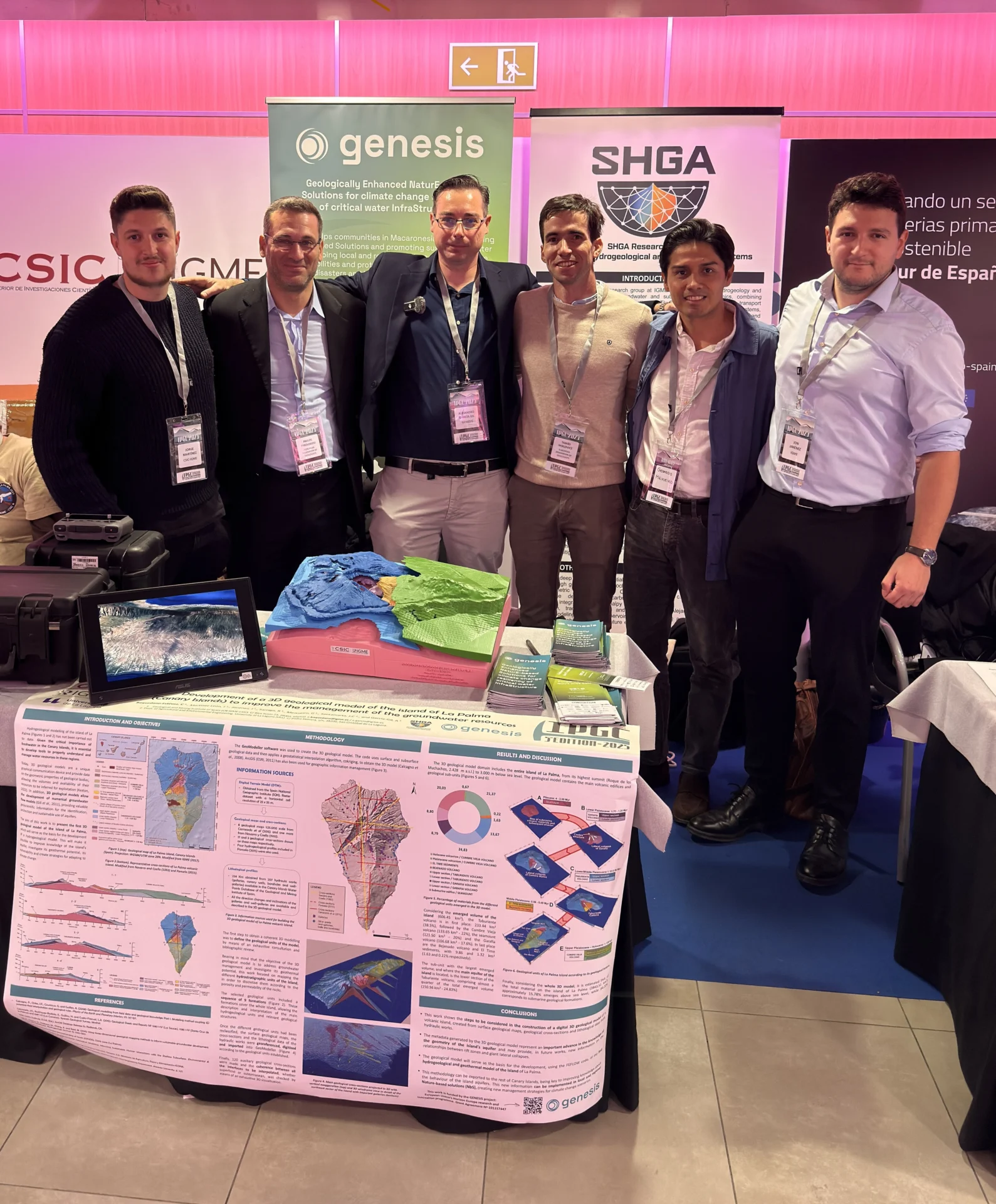 El proyecto europeo GENESIS formó parte del stand del IGME-CSIC en el 5th International Professional Geology Conference (IPGC). Se presentó el primer modelo geológico totalmente impreso en 3D realizado por el IGME-CSIC: un modelo a escala 1:100.000 de la isla de La Palma, diseñado por Carlos Baquedano Estévez e impreso en 3D por Alejandro García Gil, marcando un hito en la visualización geológica y la comunicación geocientífica. También presentamos varios pósteres que destacan cómo la energía geotérmica profunda (Jon Jiménez), la energía geotérmica somera (Jorge Martínez León) y la hidrogeología (Rodrigo Sariago) se unen para impulsar un modelo sostenible de gestión del agua y la energía.